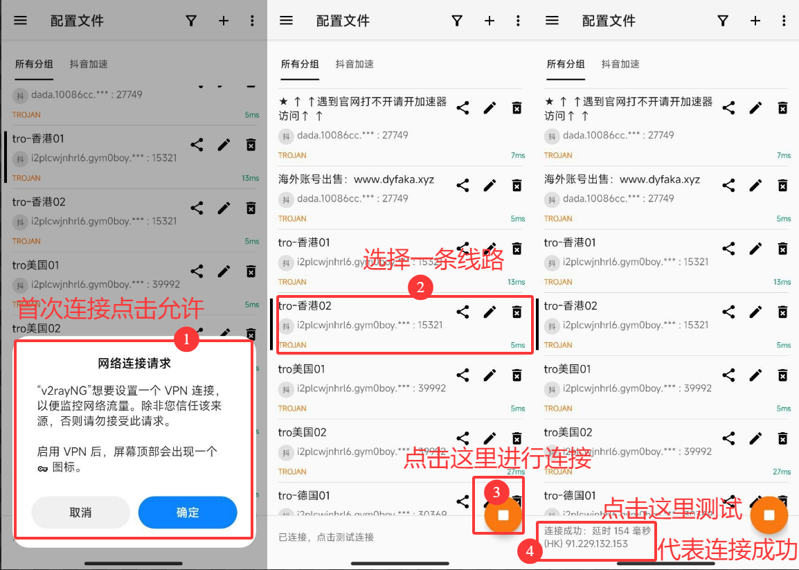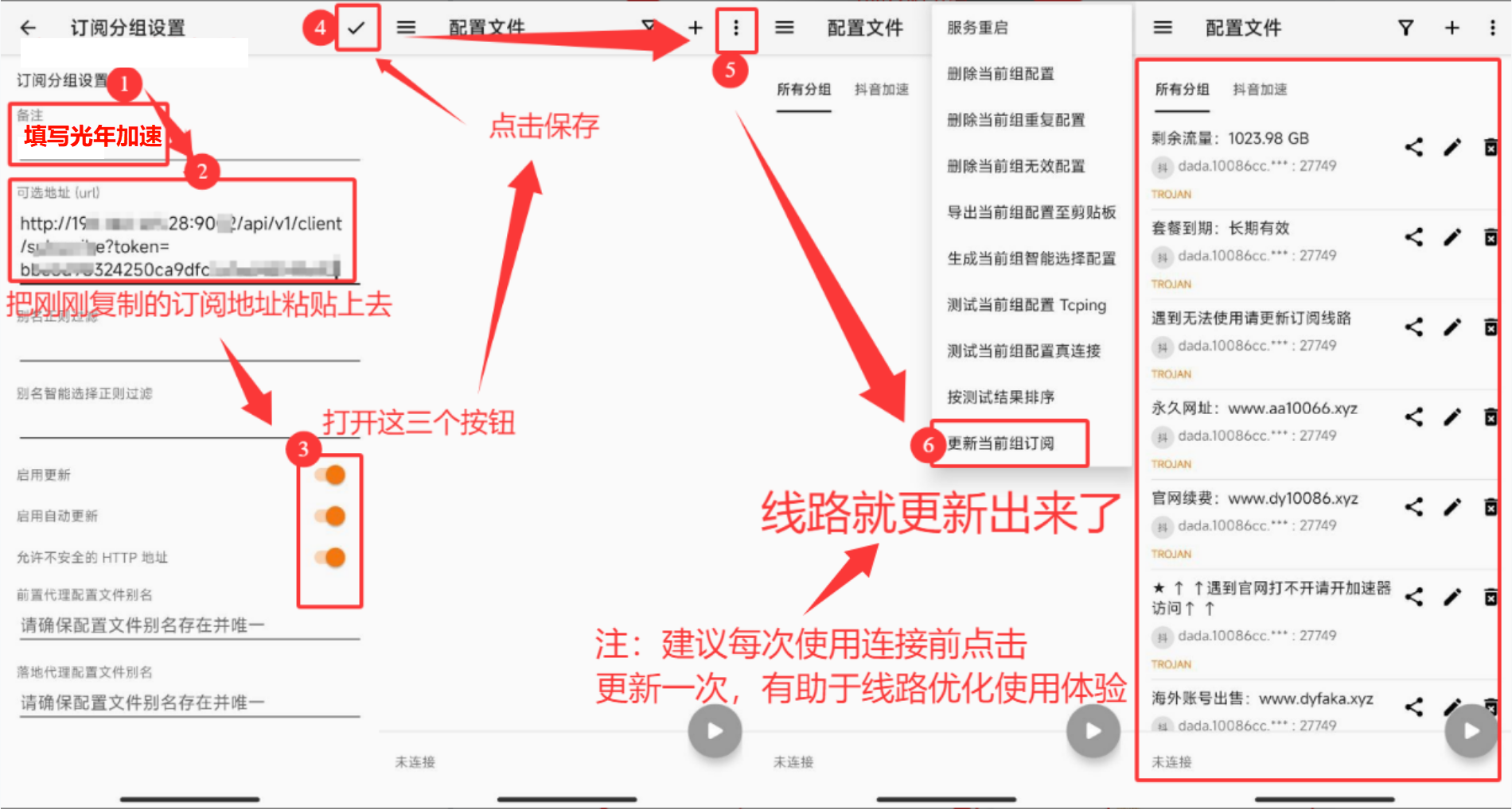 ### 1. 打开官网 * 打开手机上的 “浏览器” 软件,点击下方的<光年加速器官网> * [⬇️ 官方网站1](http://8.138.16.155:9001/#/register?code=cwYck9PD) * [⬇️ 官方网站2](http://50.114.113.245:8001/#/register?code=cwYck9PD) ### 2. 注册账号 * 首次使用需要注册账号: * 📧 使用邮箱作为登录账号 * 🔑 设置密码 * 💌 如有邀请码请填写 * 点击“立即注册”进入注册页面 * 点击“注册”完成账号创建  ### 3. 订阅须知 ⚠️ 重要提示: * 必须购买“订阅套餐”才能使用加速功能 * 点击“购买订阅” * [有兑换码点击查看兑换码使用教程](https://www.uujc.xyz/doc/53/)  ### 4.下载V2ray并且导入使用 * [⬇️ V2ray下载链接1](http://125.208.22.250:9001/v2rayNG-v7a.apk) * [⬇️ V2ray下载链接2](http://125.208.22.250:9001/v2rayNG-v8a.apk) * 点击上方链接下载好v2安装之后返回之前的网页点击导入订阅  * 1.打开V2ray NG - 点击左上角三条杠 - 点击设置 - 勾选ipv6和跳过安全证书后返回主页  * 2.打开V2ray NG - 点击左上角 - 点击订阅分组设置 - 点击右上角加号添加订阅  * 3.备注填写光年加速,粘贴订阅地址,打开三个更新允许开关 - 点击右上角√保存 - 返回V2ray NG首页 - 点击右上角三个点 -更新订阅 建议每次使用前都点击更新订阅获取最优路线  * 4.继续点击右上角三个点 - 测试全部配置Tcping - 右侧会显示绿色数字,选择数字小的国家节点 - 点击右下角按钮【连接成功后按钮会变成黄色】  * 5.如果是首次连接 会弹出网络连接请求 点击确定 点击测试连接 如果这里连接成功 则表示国外网络正常使用了